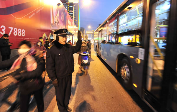 平安夜,客流增加,公交服務(wù)督導(dǎo)隊(duì)員有序指揮車輛,確保乘客走好走了