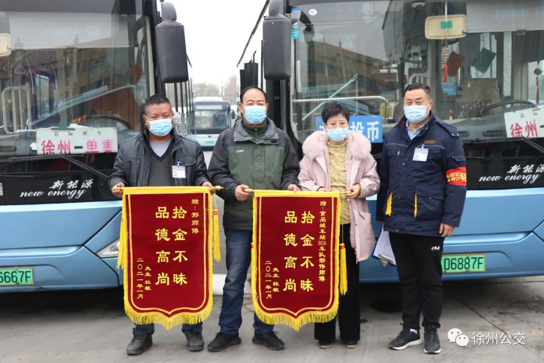1月21日下午3時,一位女士拿著兩面錦旗來到淮海文博園公交樞紐調度室,感謝808路駕駛員邢偉師傅及車隊工作人員熱心幫助她尋找遺失物品。